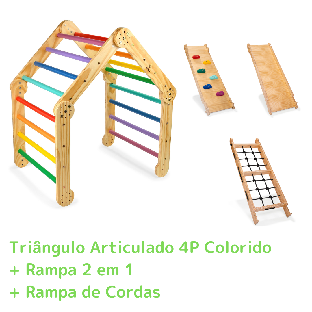 Triângulo Articulado: Inspirado na abordagem pikler, o triangulo articulado pode ser montado de pelo menos dez formas diferentes e promove o desenvolvimento motor de forma natural através da brincadeira, movimento e imaginação, incentivando a escalada, a força física, a agilidade, o equilíbrio, a criatividade e a psicomotricidade.