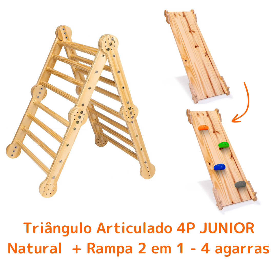 Neste Kit você está adquirindo um Triângulo Articulado 4P JUNIOR em madeira natural com uma rampa 2 em 1 - escorregador e 4 agarras profissionais de escalada, conheça mais sobre os produtos:
