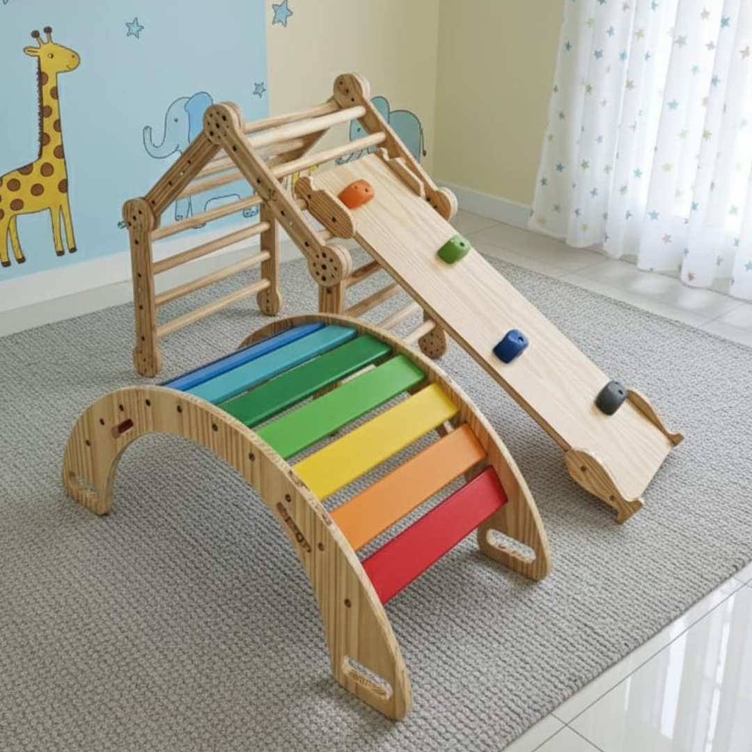 O Kit Essencial Pikler Madeira de Brincar reúne três clássicos do brincar ativo em versões mais compactas, ideais para casas, apartamentos, brinquedotecas e espaços menores, sem abrir mão da segurança, resistência e qualidade da madeira maciça.