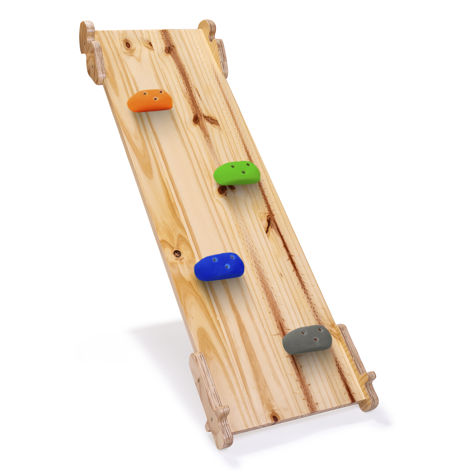 Feito em madeira compensada, com encaixes na laterais para acoplar nos triângulos, circuitos e gangorras.